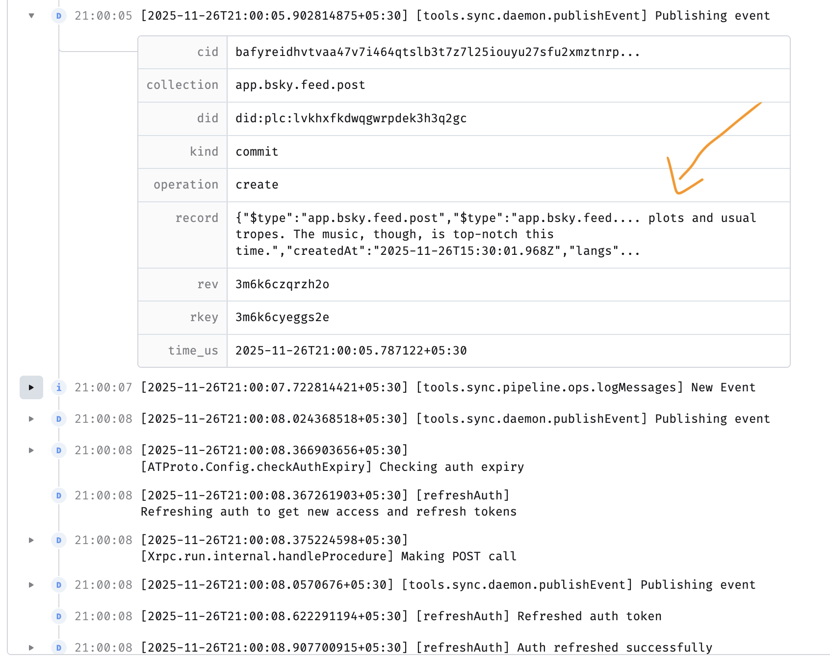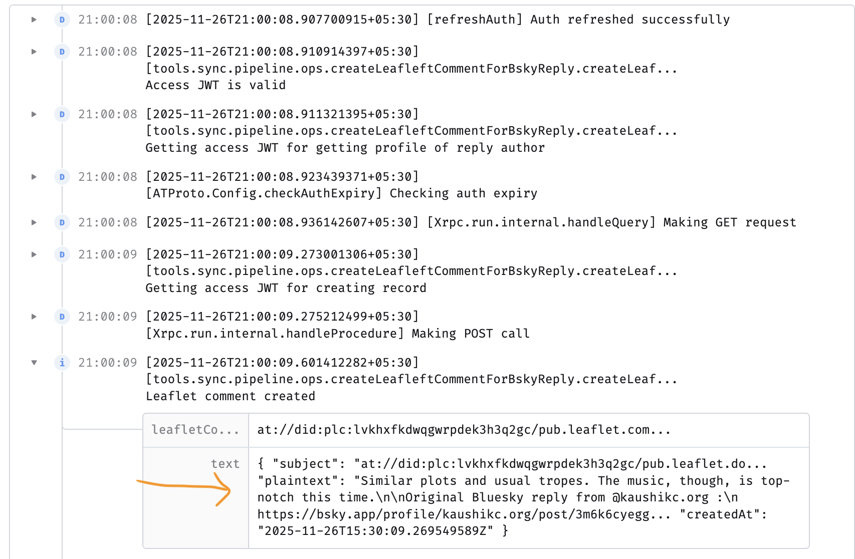 The sink prepares the data for creating the Leaflet comment and, finally, makes the relevant createRecord call to update PDS with a new comment. However, one crucial step is to figure out some details about the original Leaflet post, which was shared in Bluesky, and to that shared post, this new reply is made. Large indexes are doing this kind of backlinking, another set of applications on top of the same AT Protocol.