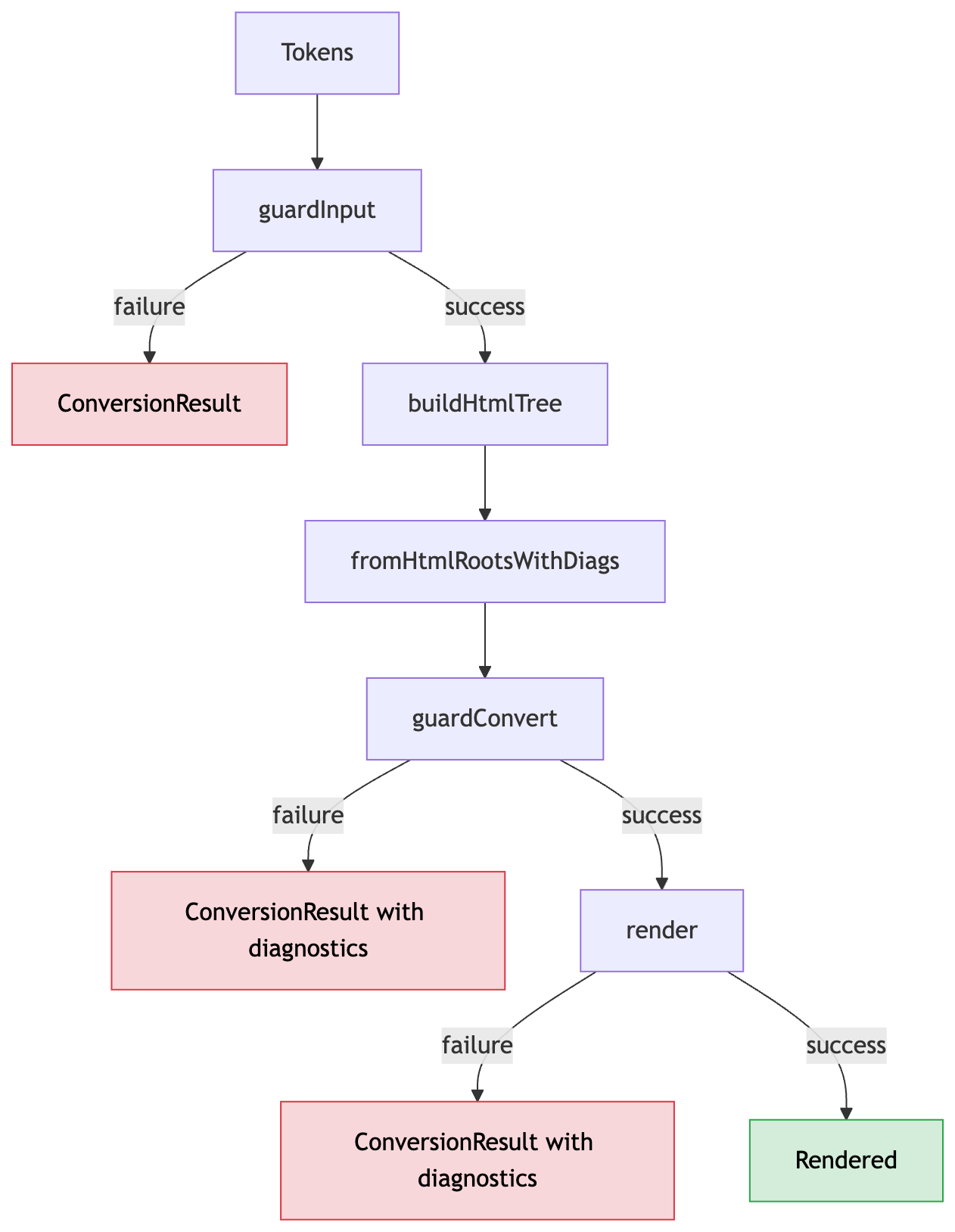 Conversion runs in three guarded stages. Each stage either short-circuits with a typed failure or passes control forward: