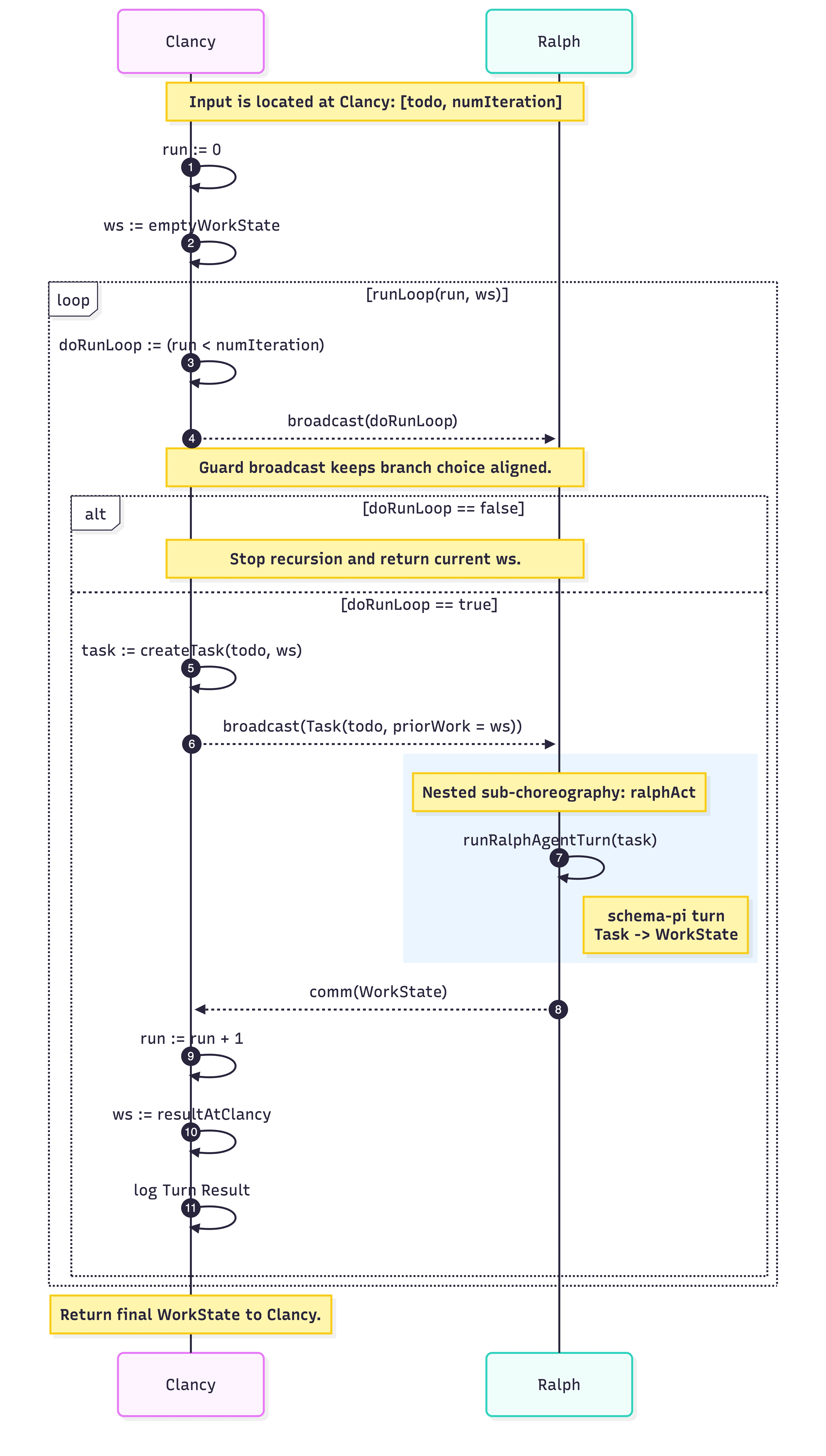 RalphLoop is a Choreography which happens in one location ralph where the argument is the Task for the agent and the output is a located-value of type WorkState at ralph. For more information on these types, check out the MultiChor paper mentioned above. ralphAct executes the agentic turn locally , i.e. this operation happens in the ralph location.